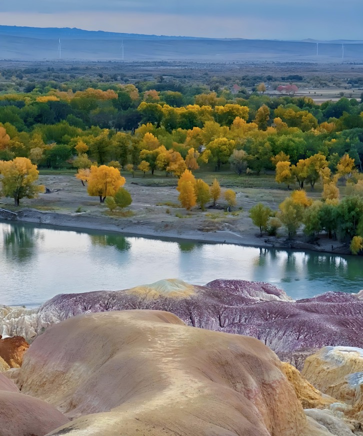 3. 五彩滩(,是一个以雅丹地貌著称的河滩。这里的丘陵地质奇特,显示出多种色彩,每到 傍晚夕阳照耀时,颜色绚烂奇幻,非常壮观。对岸是一片茂密的胡杨林,倒映在河水中景色优美,每到秋季黄叶灿烂,是拍照摄影的绝佳地点。门票50/人,游玩时间3-4h)